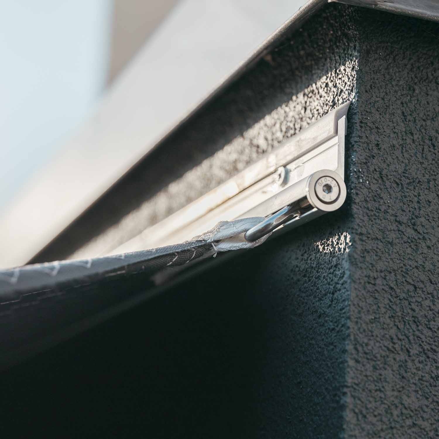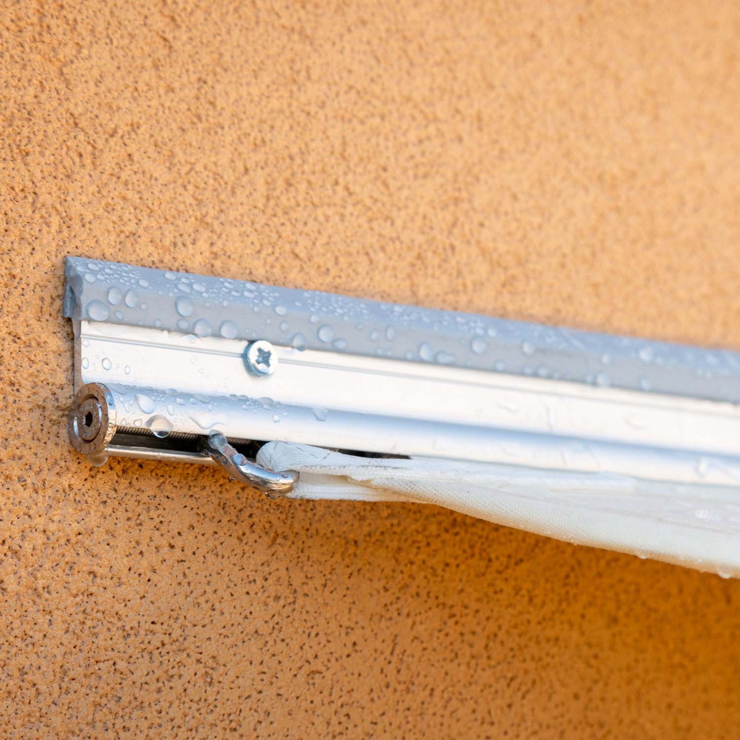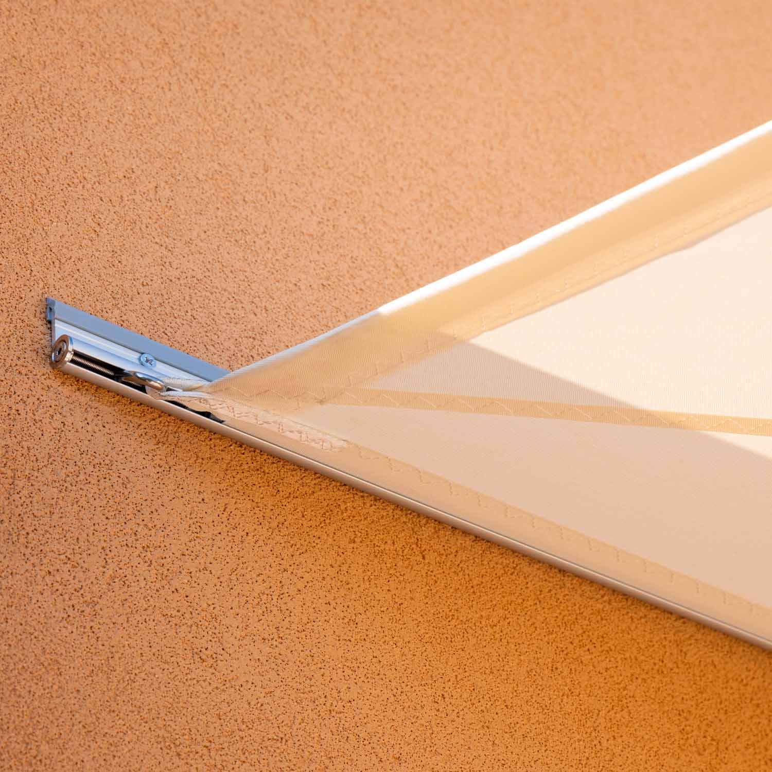 Il profilo in alluminio fissato sull’intero lato della vela non permette all'acqua piovana di trapassare fra vela e muro.