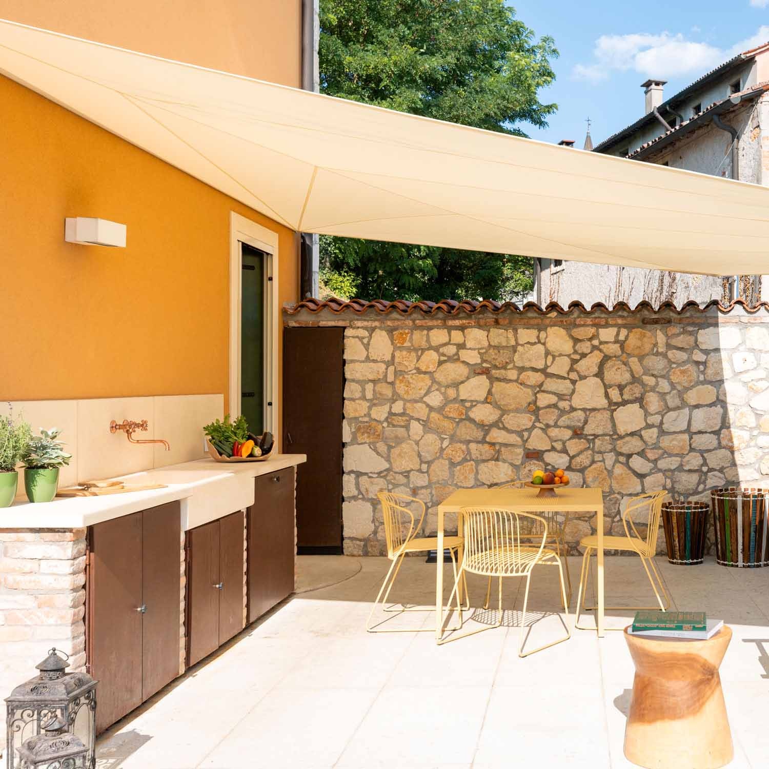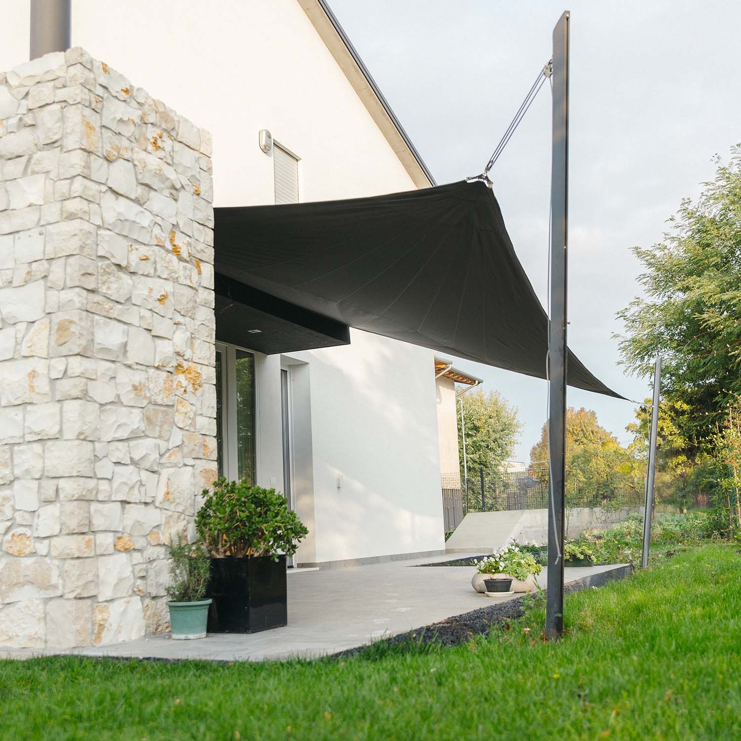 Ancorare così un intero lato della vela a una parete esterna garantisce la completa protezione dal gocciolamento e massimo comfort anche in caso di forte pioggia.