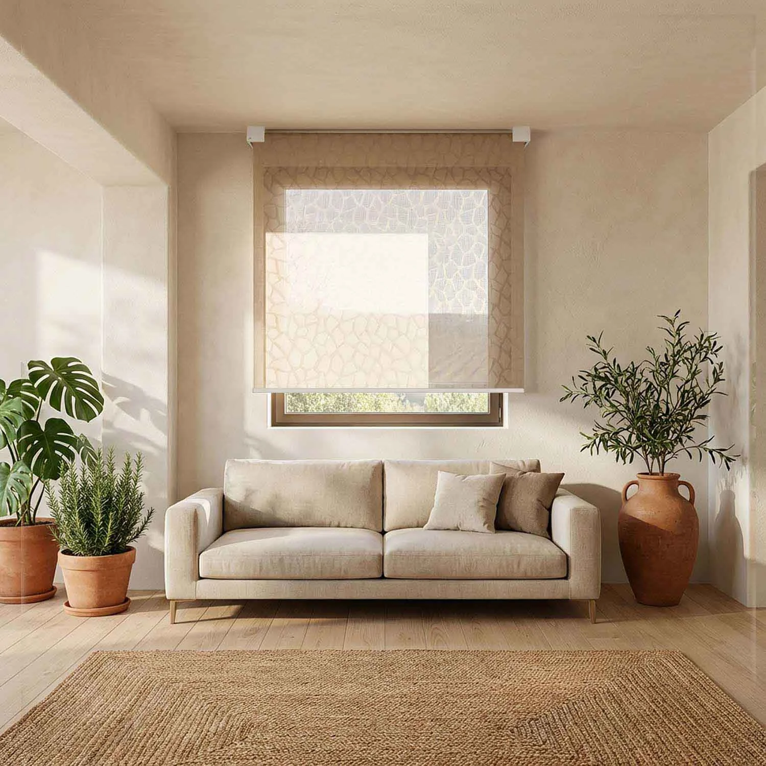 I tessuti delle tende a rullo da interno non si scelgono per il colore: si scelgono per quanta luce vuoi fare entrare. La stessa stanza, con lo stesso arredo, cambia completamente a seconda del tessuto.