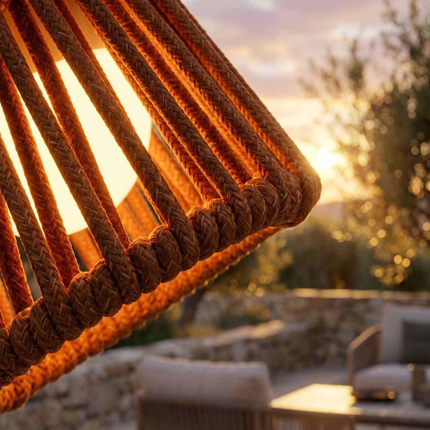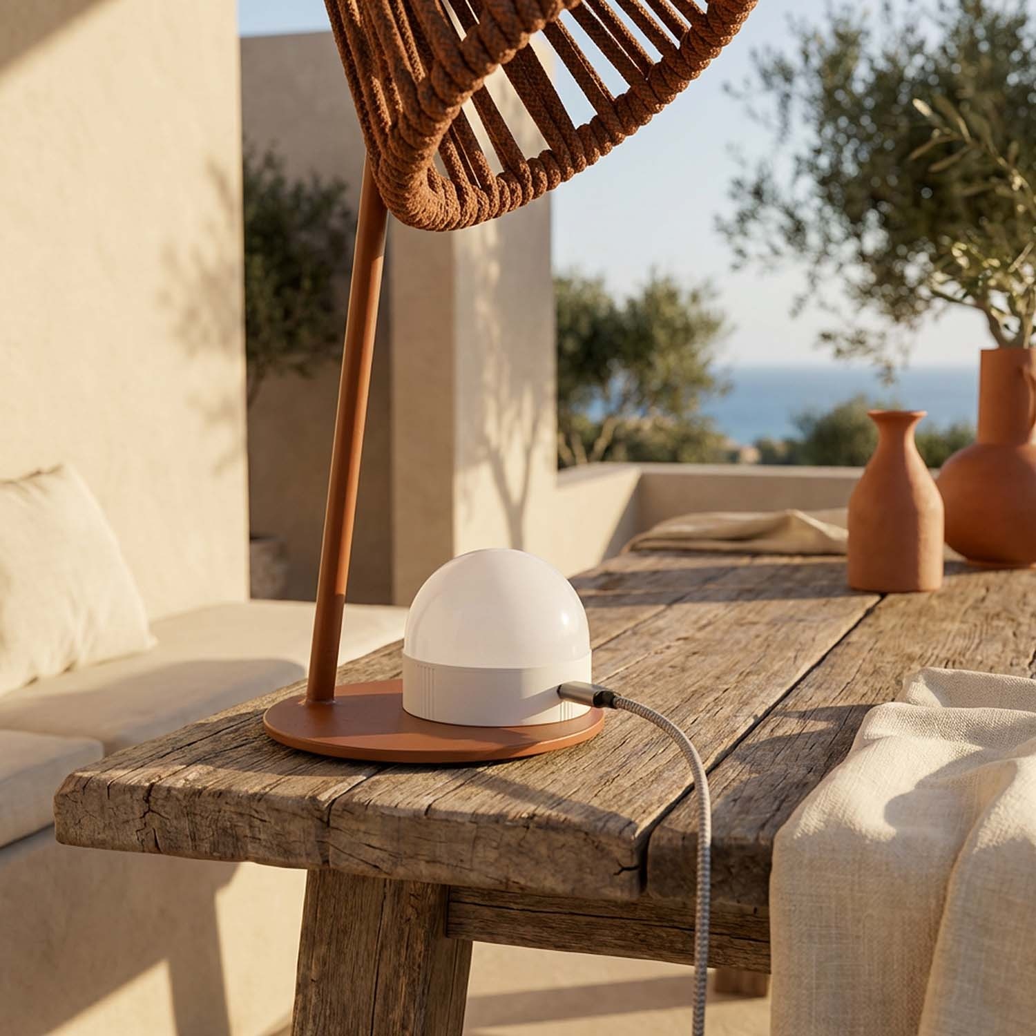 Mini Ropelle è progettata per uso misto indoor/outdoor. È perfetta per terrazze coperte, pergolati, tavoli da giardino, ma anche per salotto, scrivania e comodino. Grazie alla protezione IP44 resiste agli schizzi d'acqua, ma non è adatta all'esposizione diretta alla pioggia intensa o all'immersione.