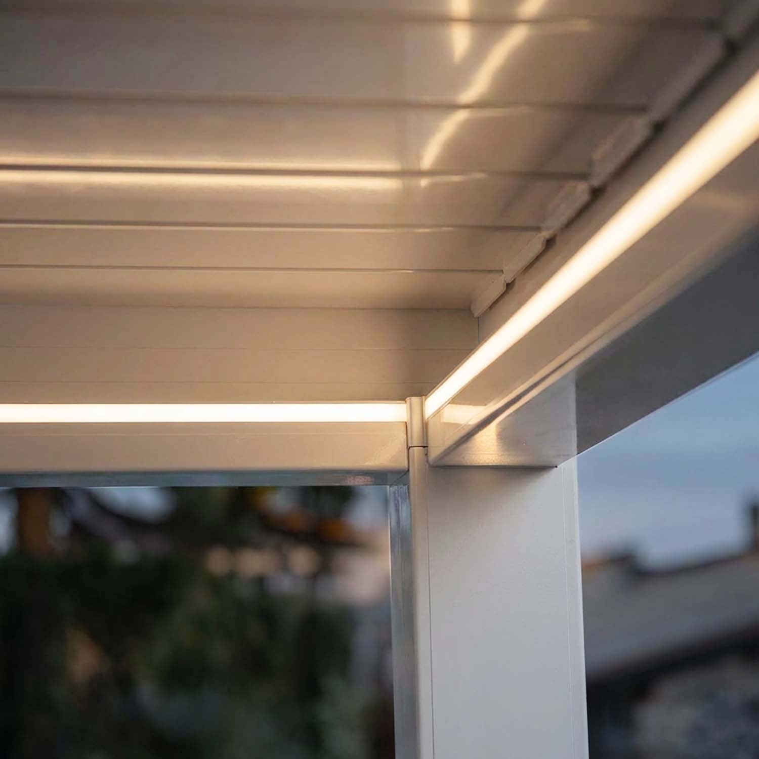Il consumo del motore è minimo: si attiva soltanto durante l'apertura o la chiusura delle lamelle (circa 20 secondi), e in standby consuma meno di 1W. I LED perimetrali consumano circa 15-20W per metro durante il funzionamento. Per una pergola 3×3 m con 12 metri di LED, il consumo massimo a piena luminosità è di circa 180-240W, analogo a una serie di luci da terrazzo.