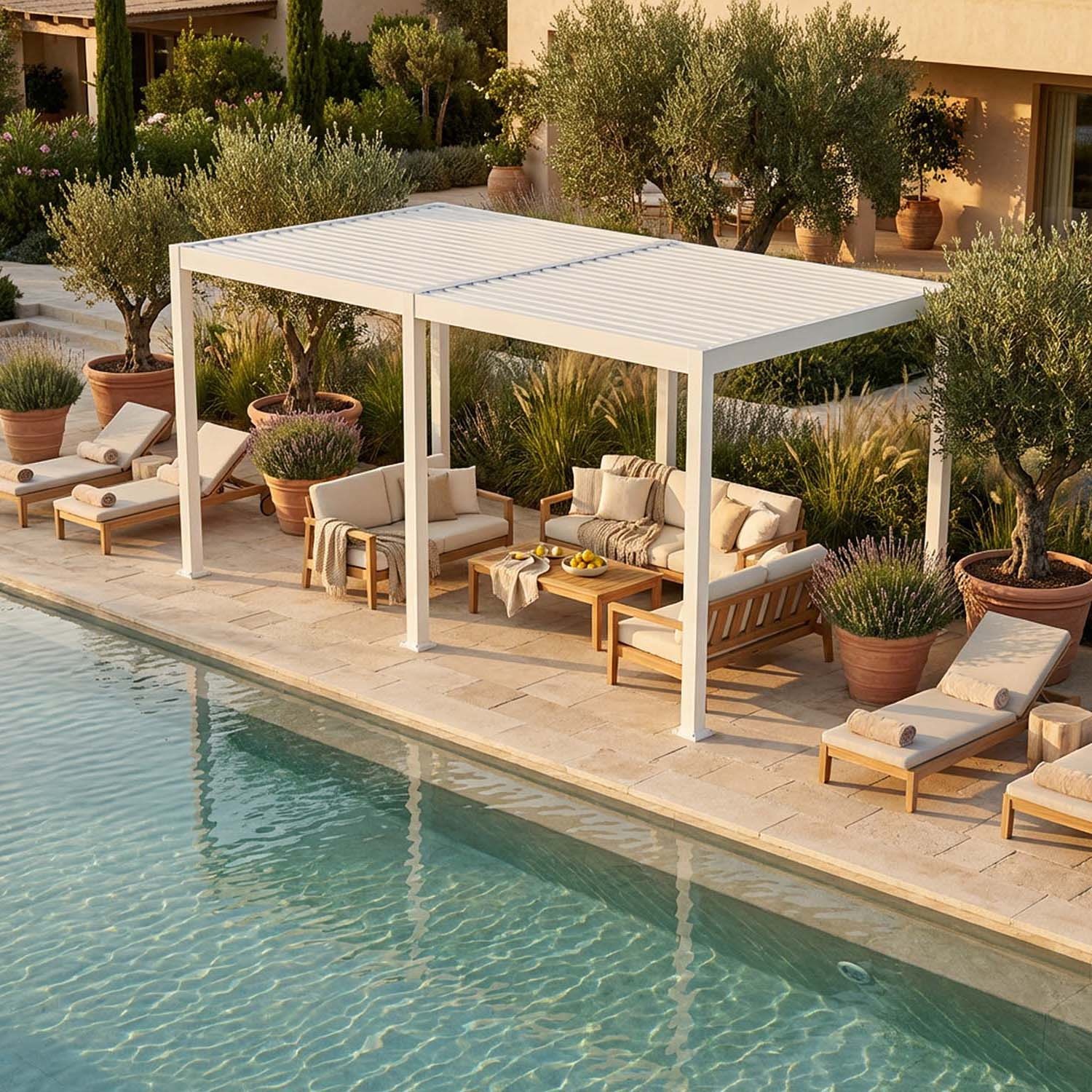 Protegge dal sole diretto nelle ore più calde senza rinunciare alla luminosità, rendendo l'area piscina confortevole e usabile anche in piena estate.