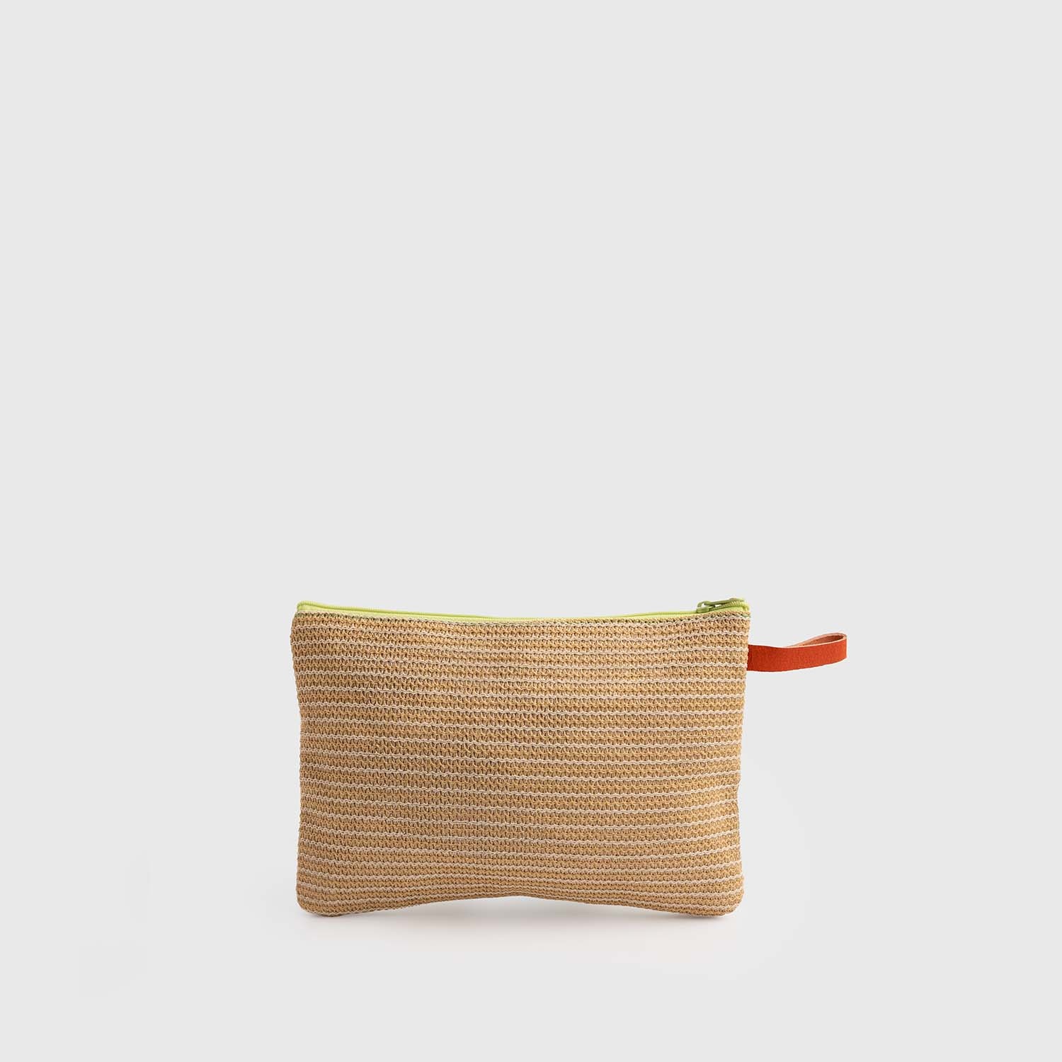 Pochette realizzata con la formula del riciclo creativo, bicolore con dettagli verdi, azzurri e arancioni con chiusura superiore con zip.