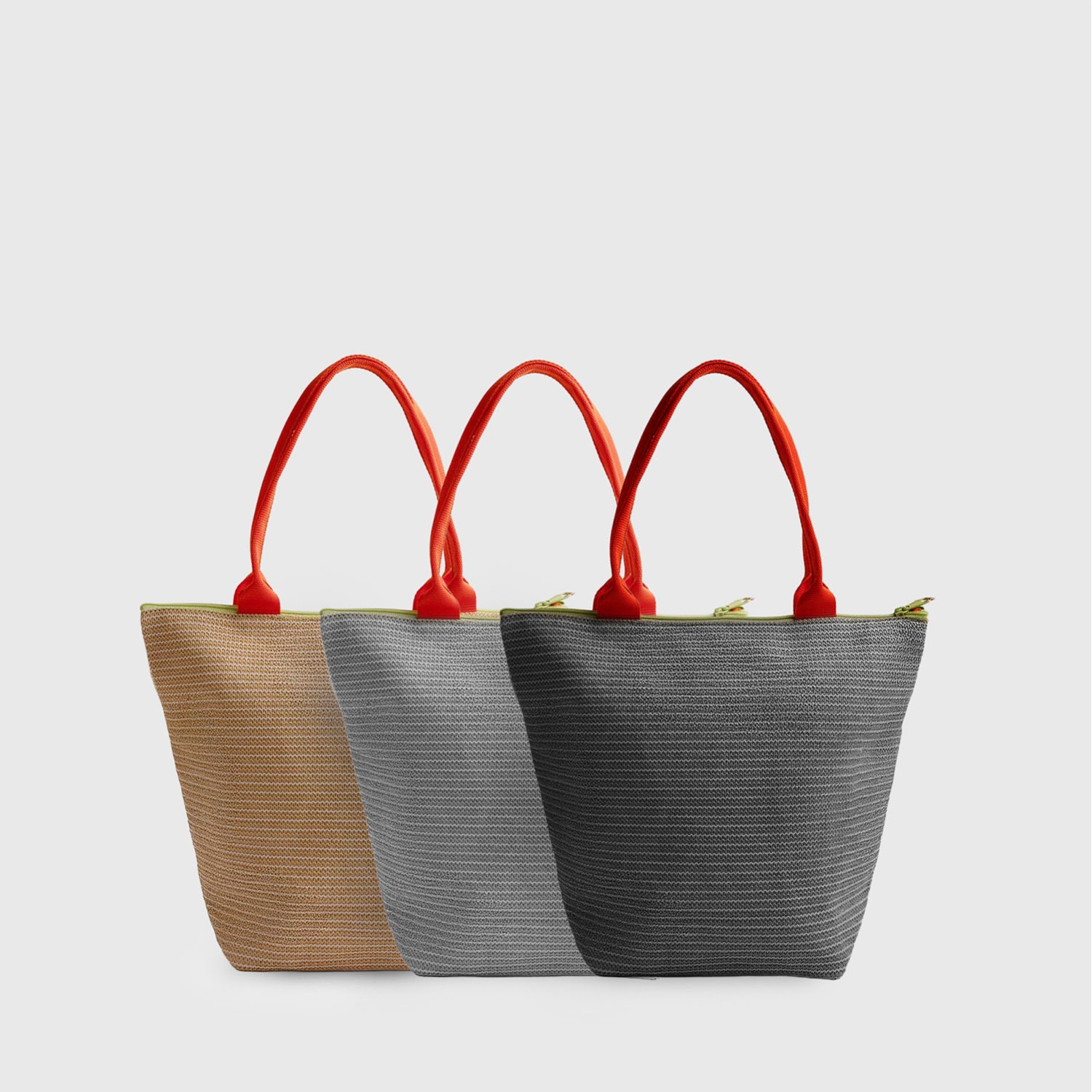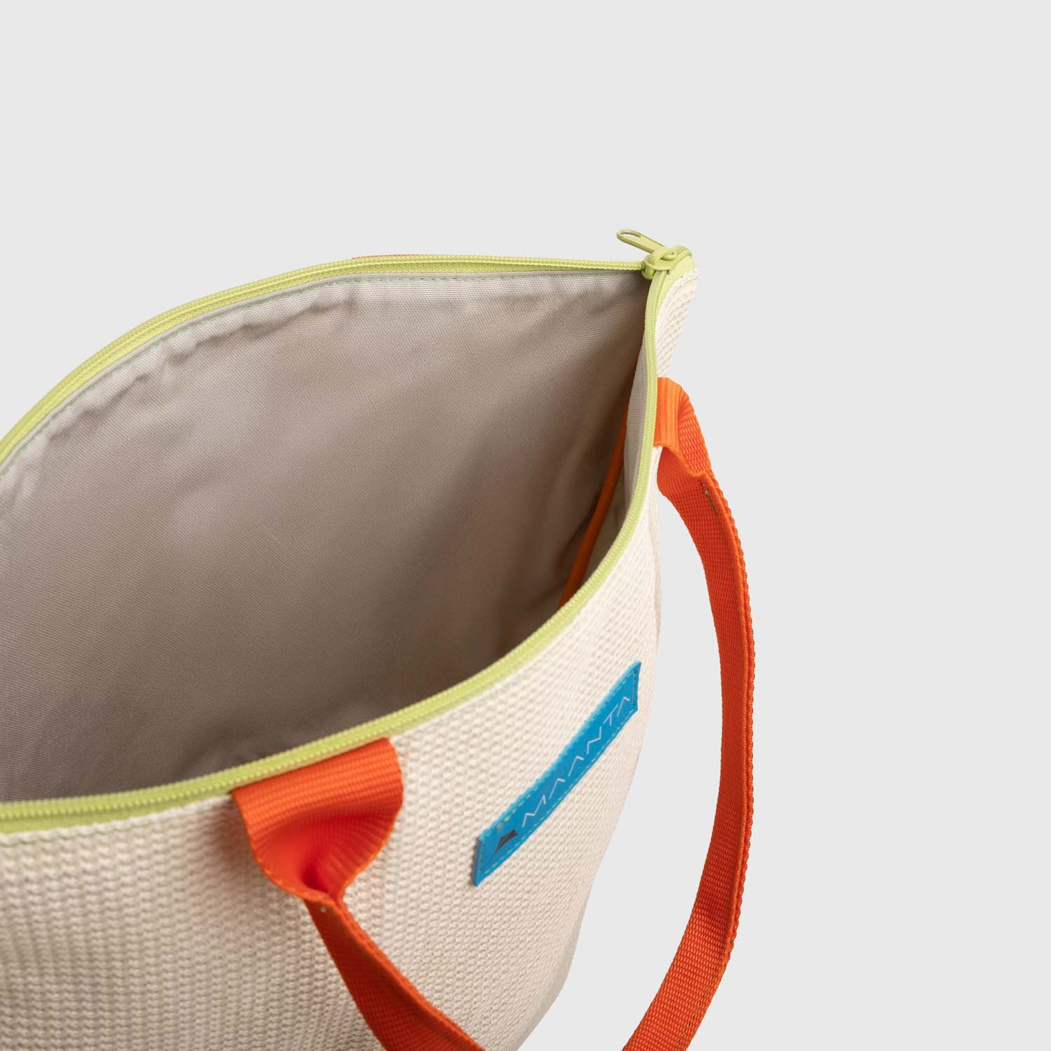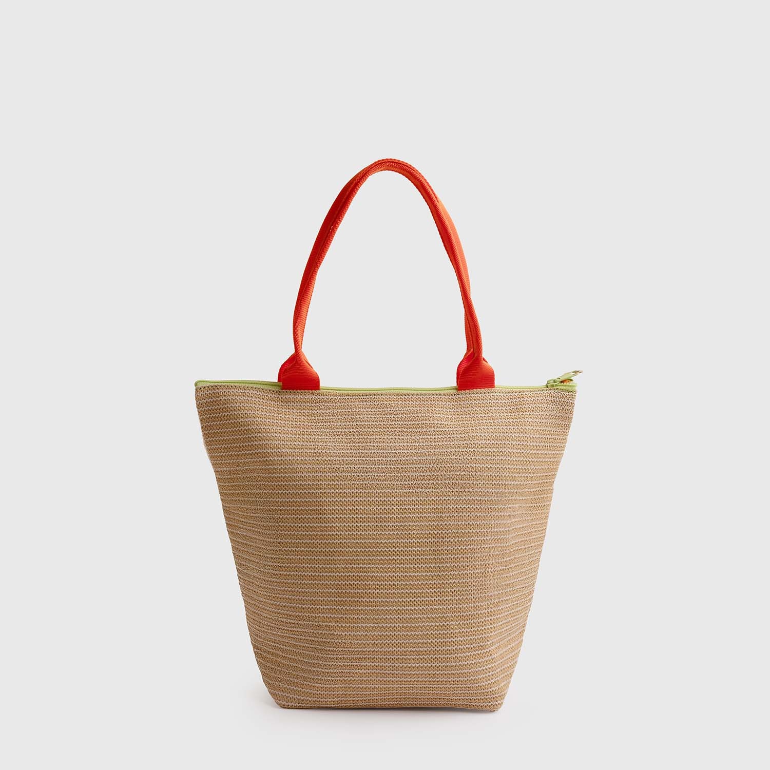 Borsa bicolore con inserti arancioni e dettagli in colore verde e azzurro, comodi manici in tessuto, chiusura superiore con zip.