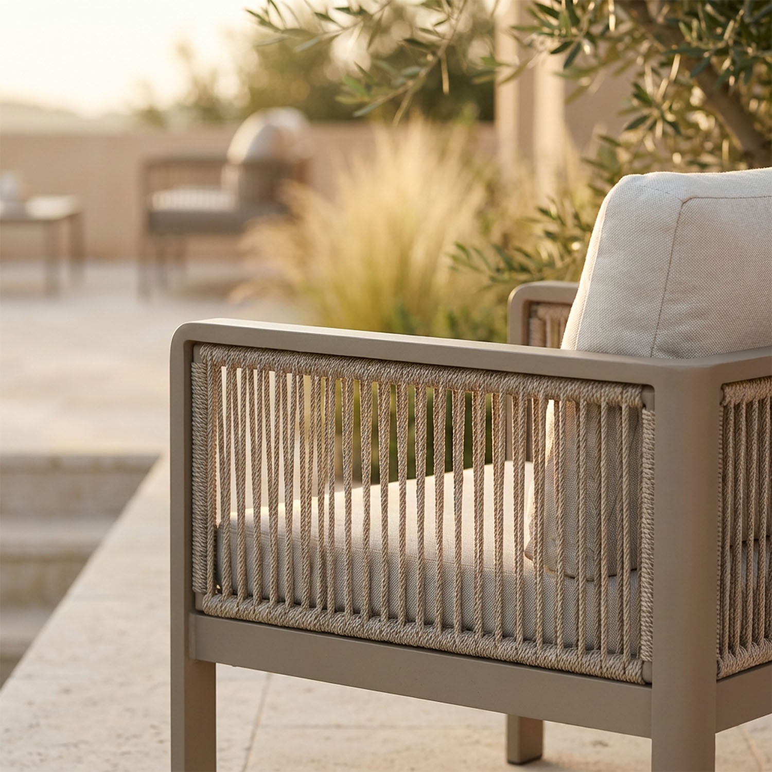 Un'isola di comfort nel verde: la corda olefin intrecciata a mano si integra visivamente con la vegetazione e i rivestimenti naturali. Il set resiste ai raggi UV senza sbiadire: rimane bello anche dopo estati intense.