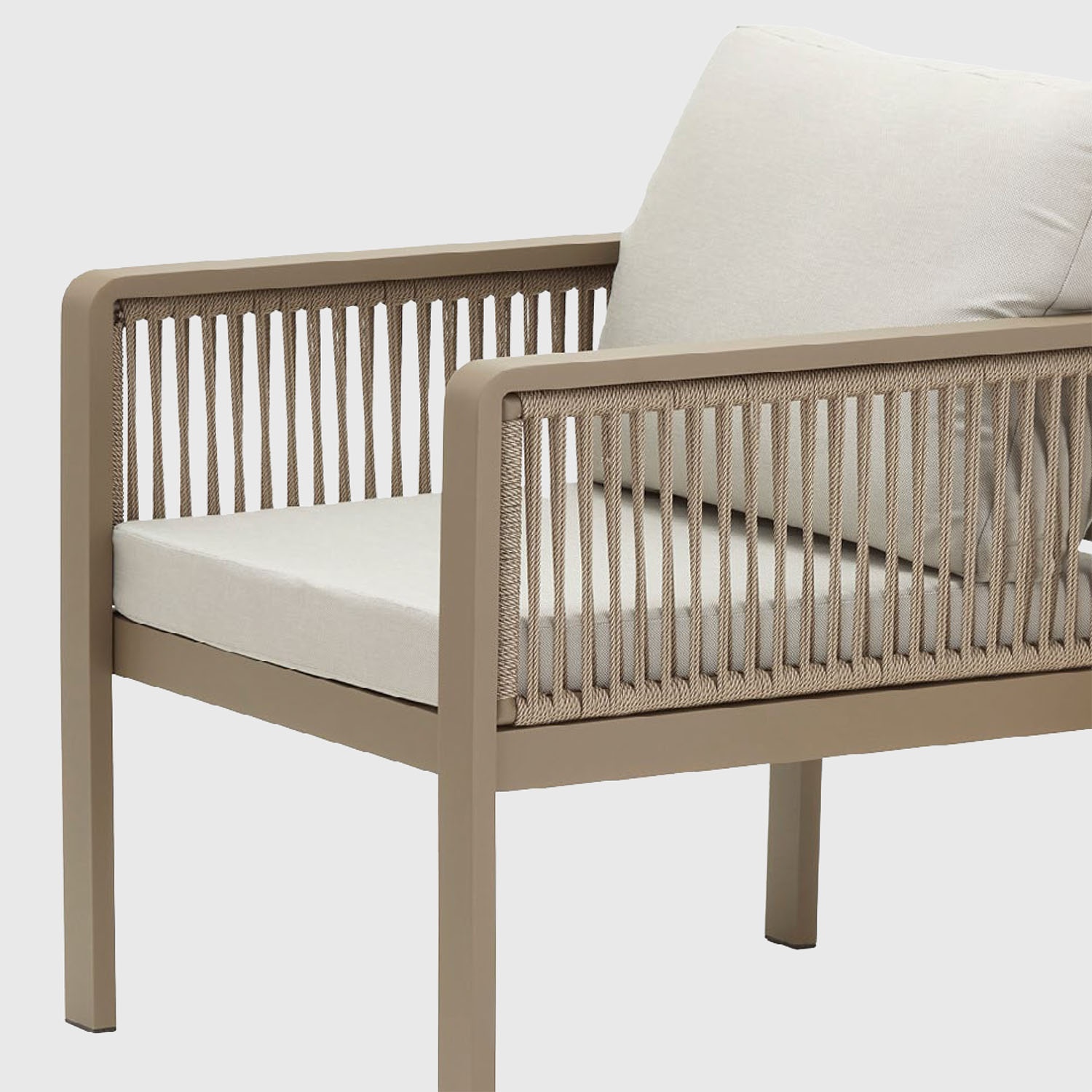 Struttura in alluminio tortora con corda olefin intrecciata a mano. Dimensioni 130×67×74 cm. Include cuscino seduta e cuscino schienale in Olefin colore sabbia.