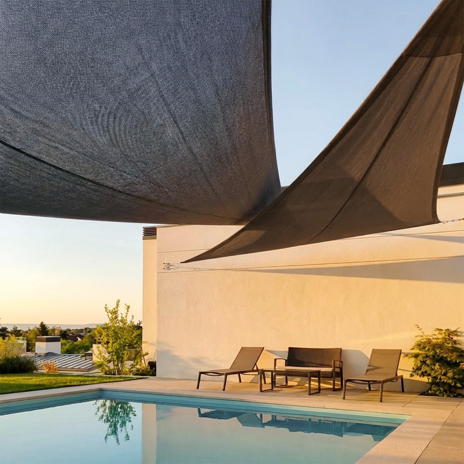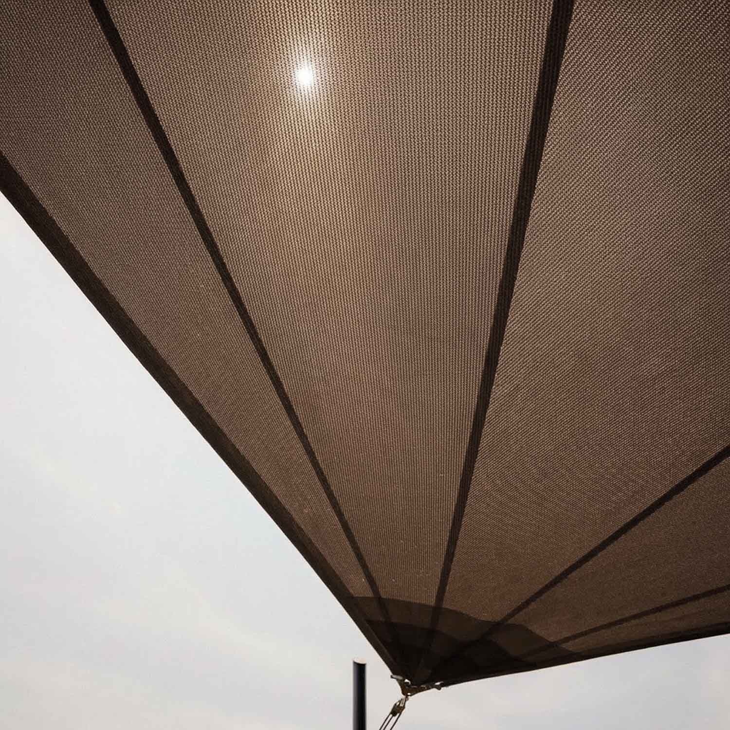 Solaria traspirante è una vela ombreggiante con taglio radiale realizzata con tessuto Meshnet® HDPE 320 traspirante che protegge da caldo intenso e grandine e ripara da raggi UV e vento forte.