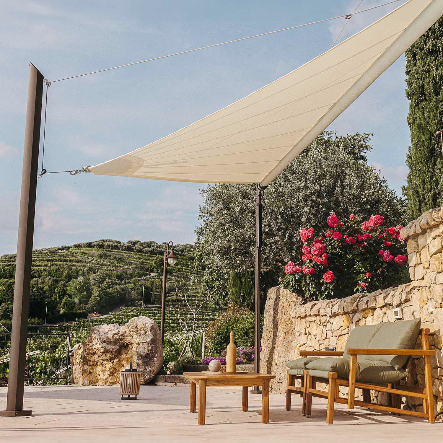 Questa tenda a vela avvolgibile motorizzata richiede pali progettati appositamente da Maanta, dotati di piastre specifiche per il suo sistema di aggancio motorizzato. Se hai già altri pali, purtroppo non potrai utilizzarli con Zefira.